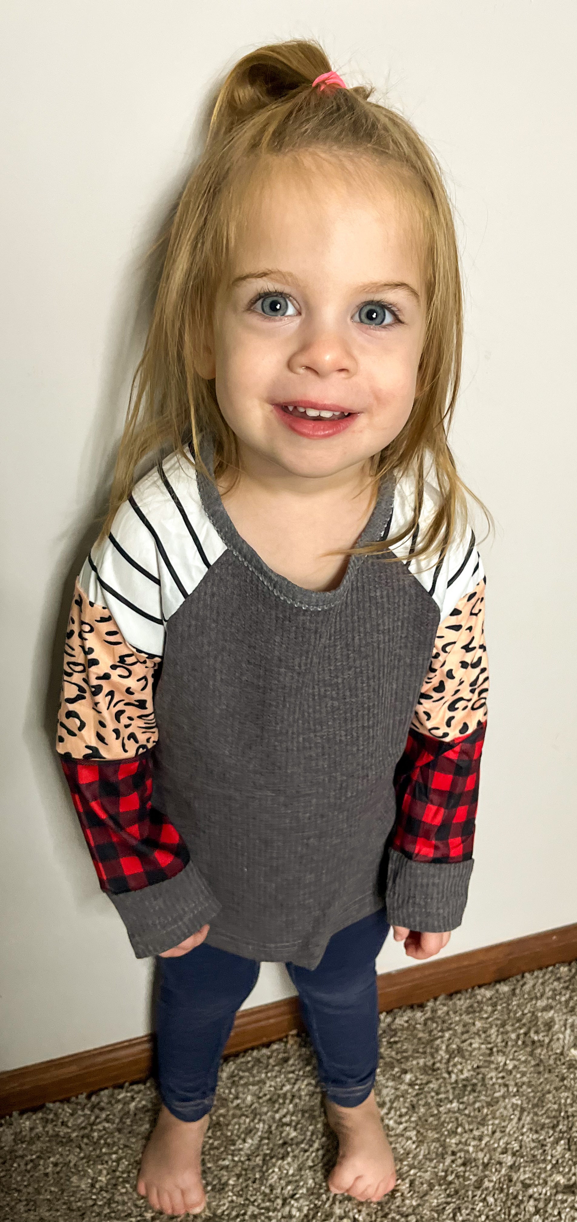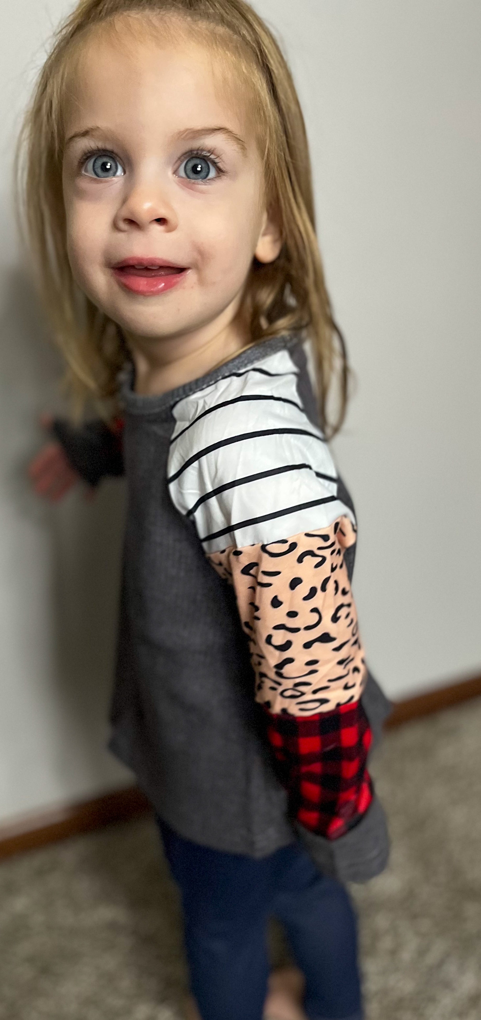 Gah I wish this came in my size!! Perfect tee for the colder temps and those patterns are perfection. Model is a petite 2T and is wearing a 2T. Cotton (not milk silk).