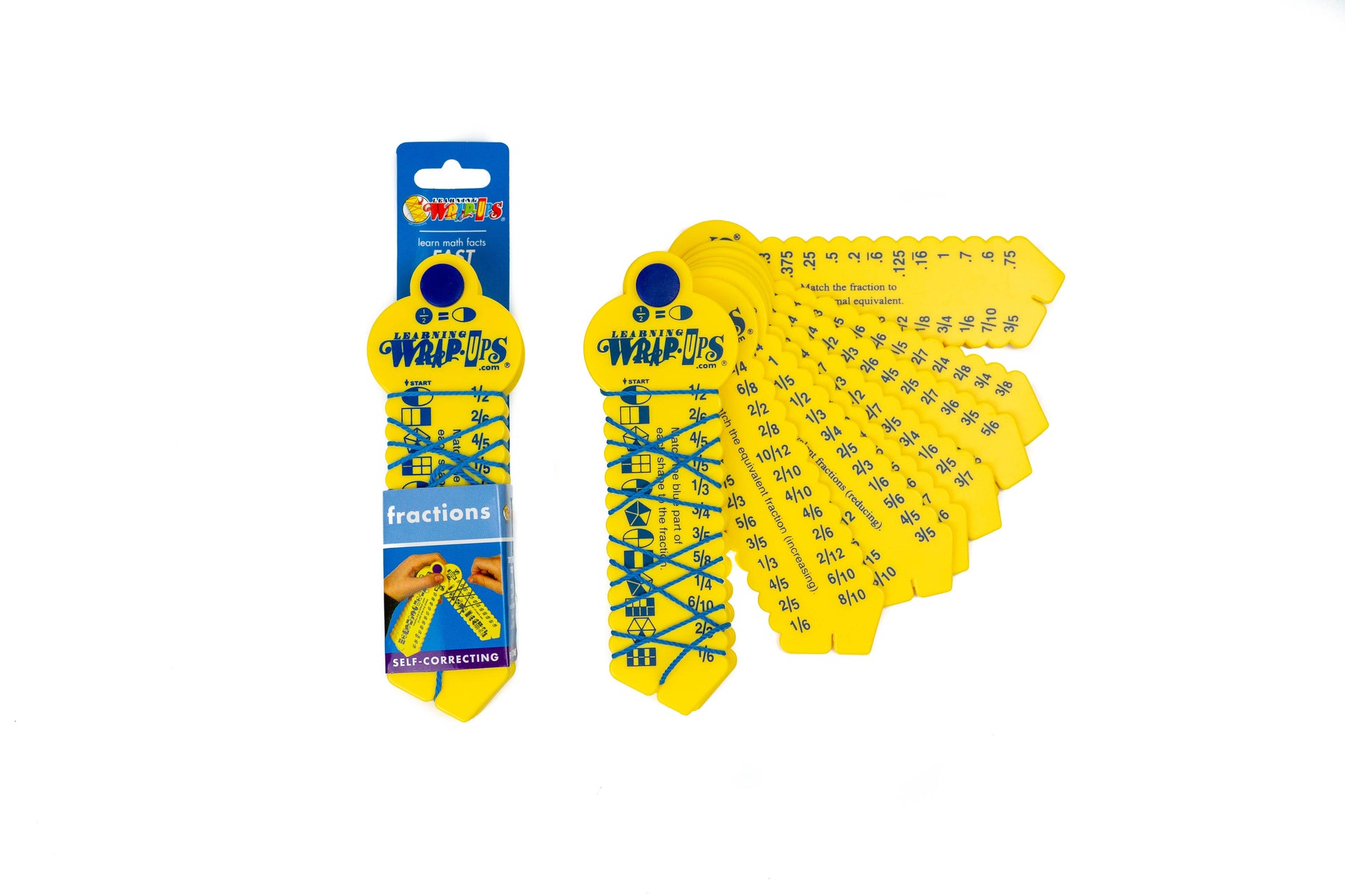 Learning Wrap-ups offer a fun and unique way to help students memorize basic fractions. Students wrap the string from the problem on the left to the answer on the right and then turn the Wrap-up over to see if they got it right. Use a stopwatch to measure improvement and to see how fast they can really go. Each set contains 10 self-correcting keys and covers all the facts for that operation.