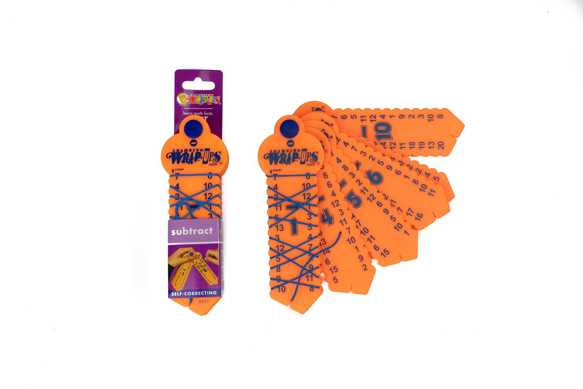 Learning Wrap-ups offer a fun and unique way to help students memorize basic subtraction. Students wrap the string from the problem on the left to the answer on the right, and then turn the Wrap-up over to see if they got it right. Use a stopwatch to measure improvement and to see how fast they can really go. Each set contains 10 self-correcting keys and cover all the facts for that operation.