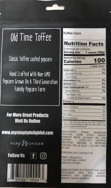 Indulge in the nostalgia of old-fashioned flavor with Simply Delightful's Old Time Toffee Corn. This classic treat is available year-round and is shelf-stable, making it a perfect snack for any occasion. Our popcorn is made with high-quality ingredients, capturing the essence of traditional toffee corn. As a brand, we are committed to delivering delight in every bite, ensuring that each batch is made right, every time. So, enjoy the sweet and savory taste of our Old Time Toffee Corn, a timeless snack that's simply the world's best.